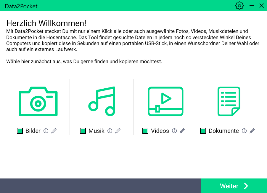 Mit einem Klick wird der gesamte PC nach Bildern, Videos und Audiodateien oder anderen Dateien durchsucht und alles auf Ihren ausgewählten USB-Stick oder bei Bedarf auf eine größere USB-Platte gezogen. So haben Sie alle Deine wichtigen Dinge immer dabei.