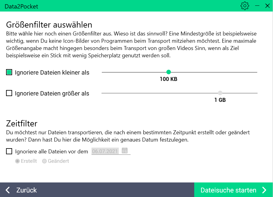 Der Größenfilter bietet Ihnen individuelle Einstellungsmöglichkeiten, so dass Sie bestimmte Dateien, je nach Größe ausgewählt, extern kopieren können.
