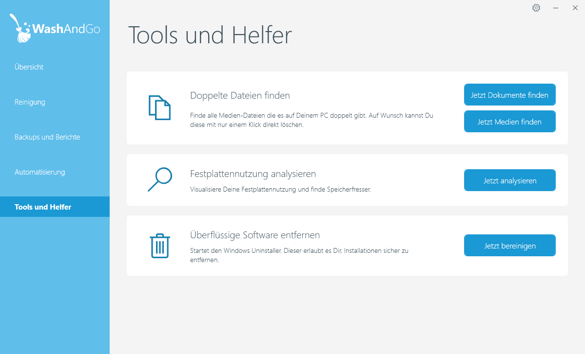 Der neue Reinigungs- und Lösch-Algorithmus findet jetzt in seinen drei Reinigungsstufen noch mehr unnötigen Ballast, der Deinen PC blockiert und verlangsamt. Dank der praktischen Backup-Funktion kannst Du selbst nachträglich Gereinigtes wieder herstellen und die zusätzlichen Tools und Helfer unterstützen Dich, wenn Du noch genaueren Einblick in die Staubfänger Deiner PCs brauchst